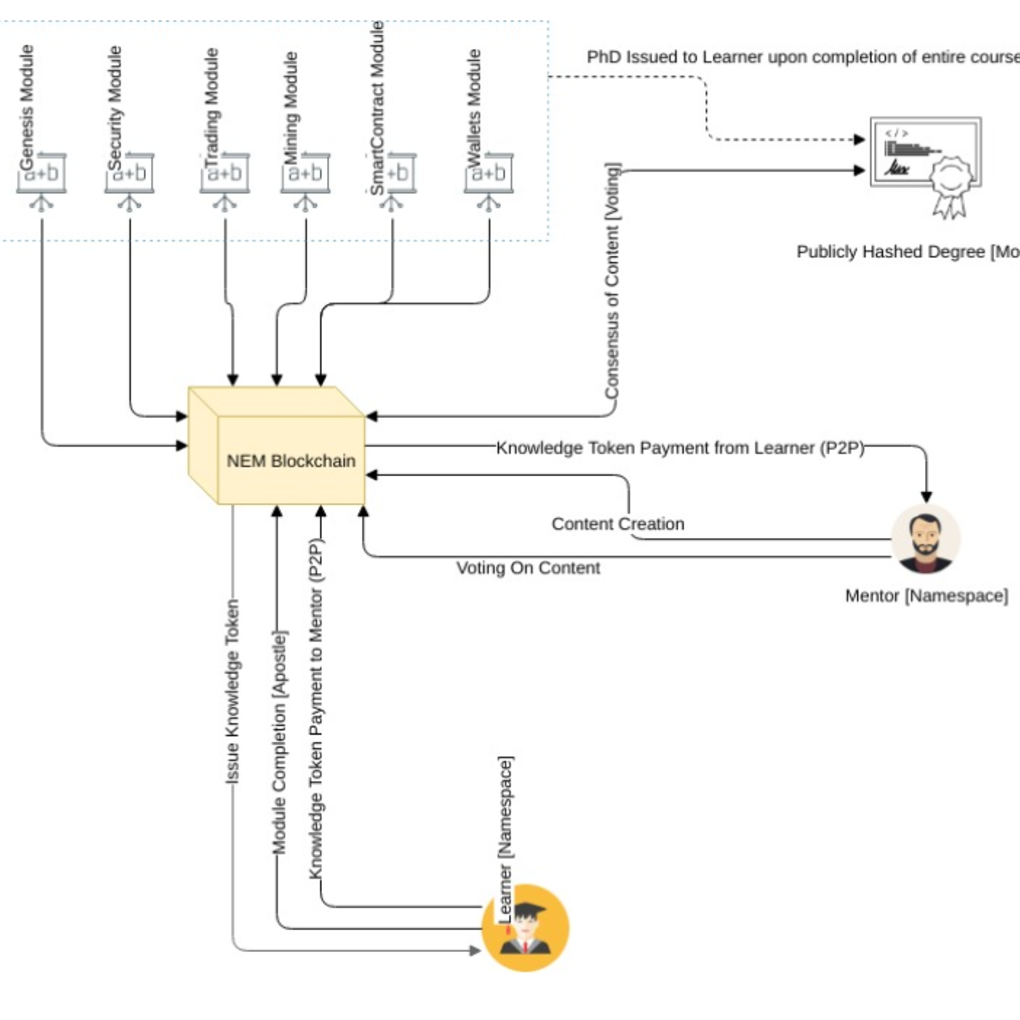 Modules are created using Mosaic by users who have attained a publicly hashed degree (PhD). The length and content of a course to attain a PhD is regulated by consensus using the NEM Voting system.